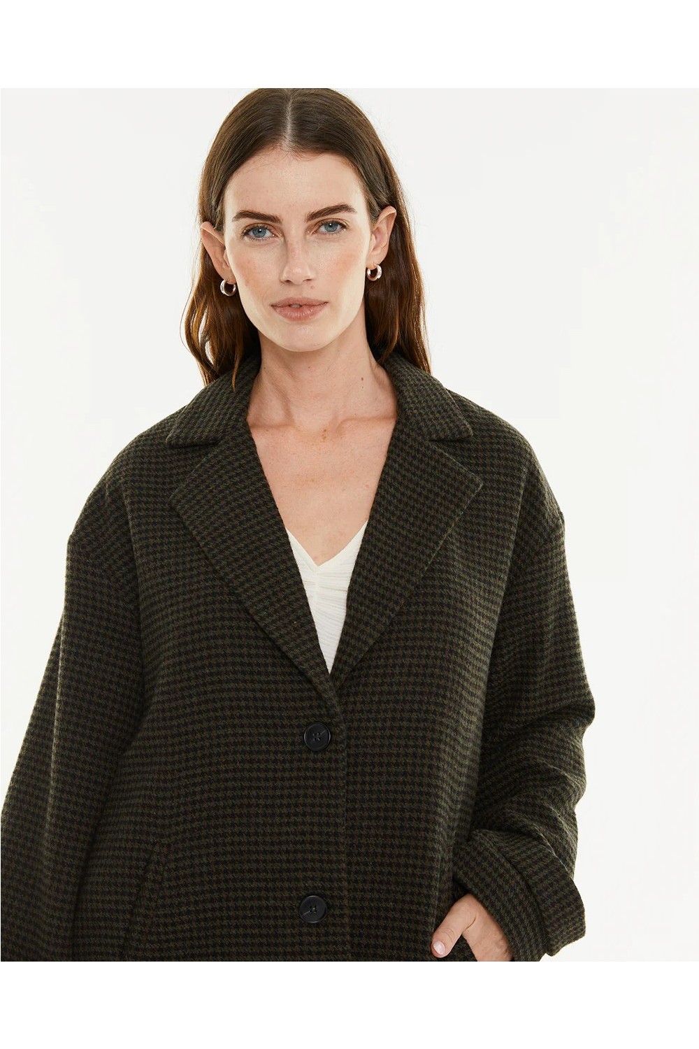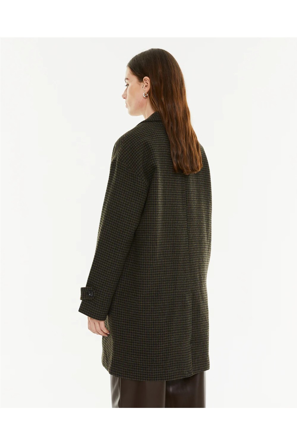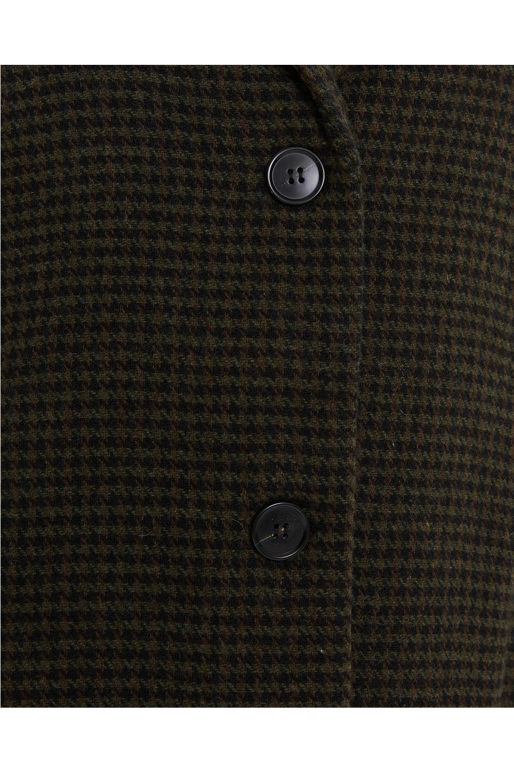 Abrigo de mujer, de talle medio, con tejido de cuadro vichy en gris y negro, escote con solapa, bolsillo tipo vivo y cierre con botón.