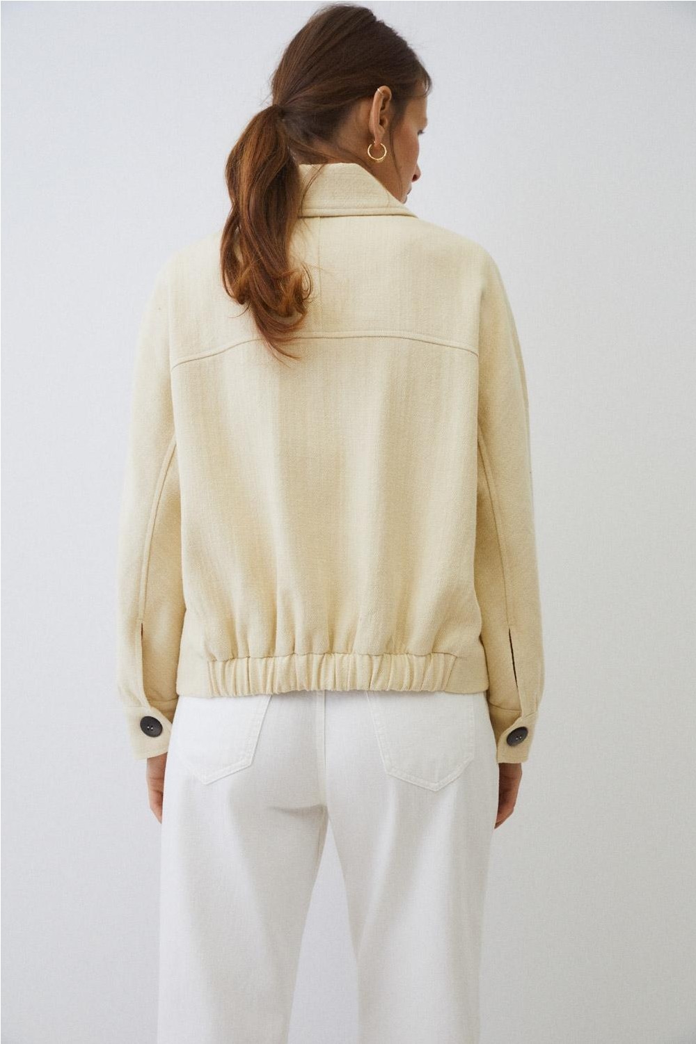 Chaqueta 100 algodón orgánico en tejido rústico. Tejido Charka de Manteco, tejido italiano elaborado con múltiples filamentos en algodón con certificación sostenible GRS y OCS inspirado en las antiguas máquinas indias de hilar a mano caracterizado por su aspecto artesanal. Diseño estilo cazadora. Cuello con solapa. Manga larga japonesa. Dos bolsillos laterales. Cierre frontal simple de botones. Con forro. Fitting recto.