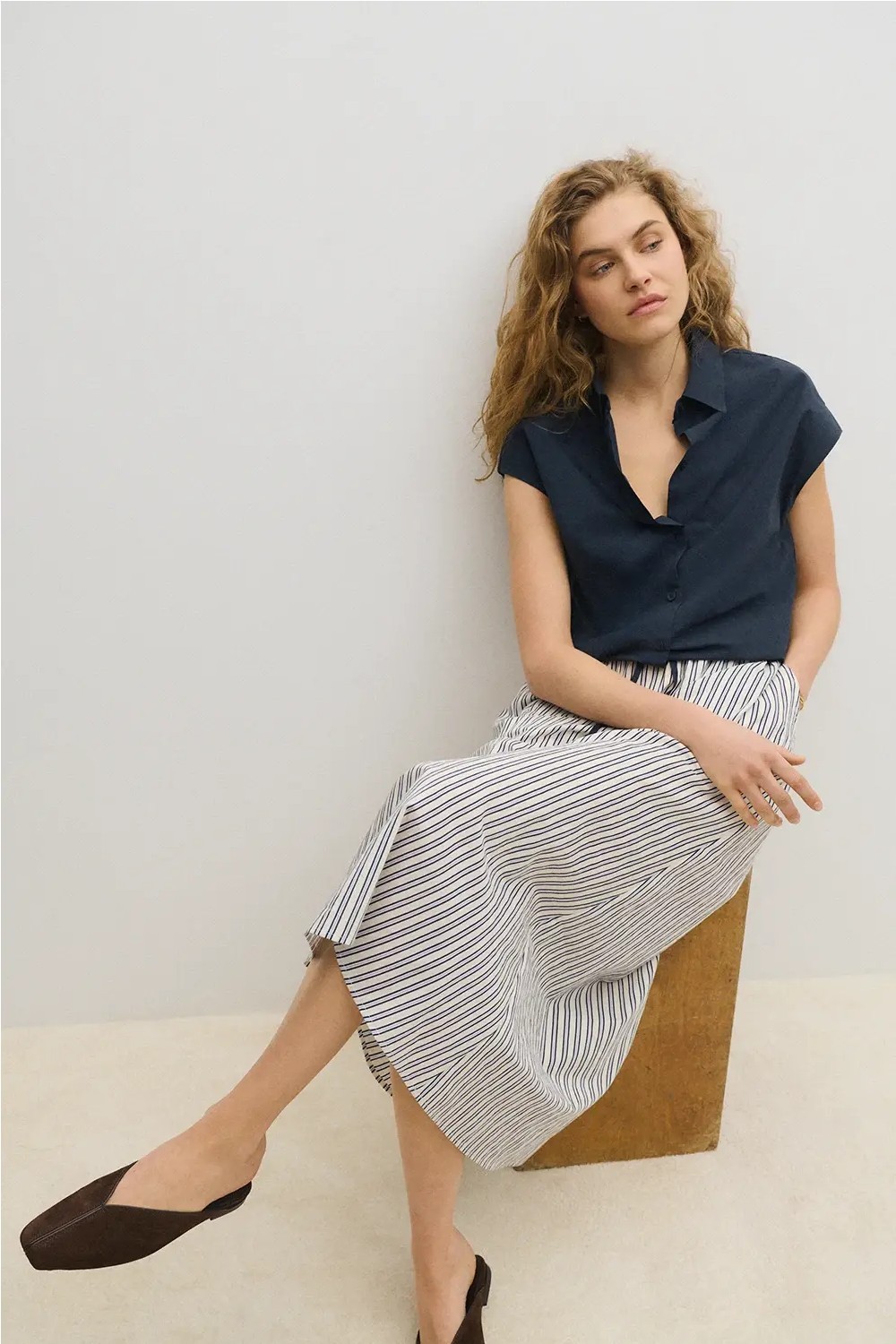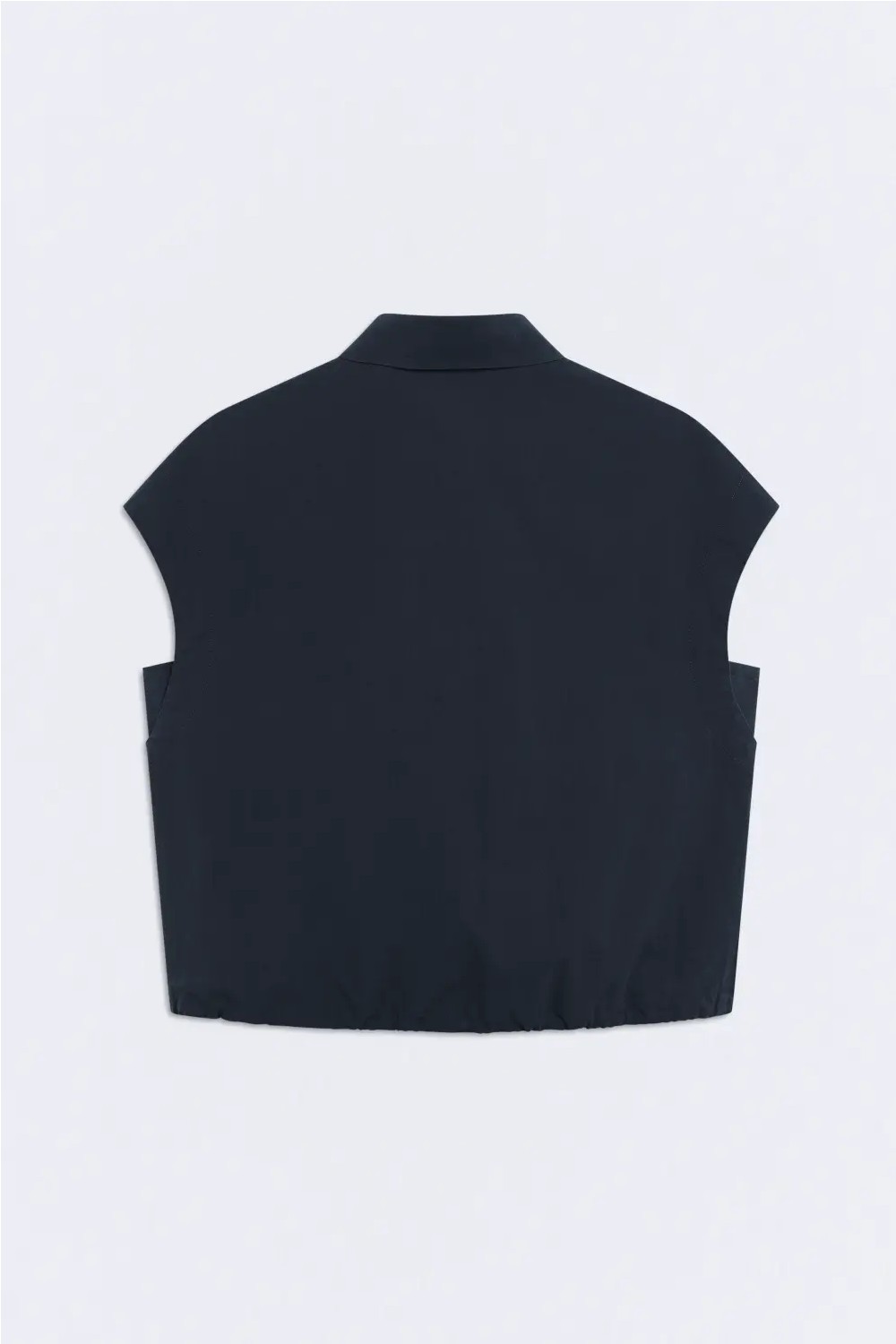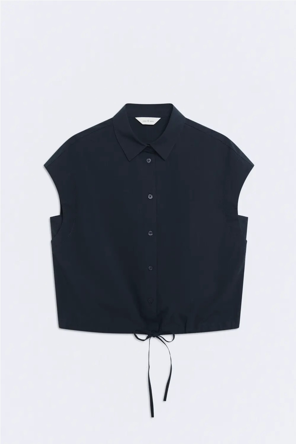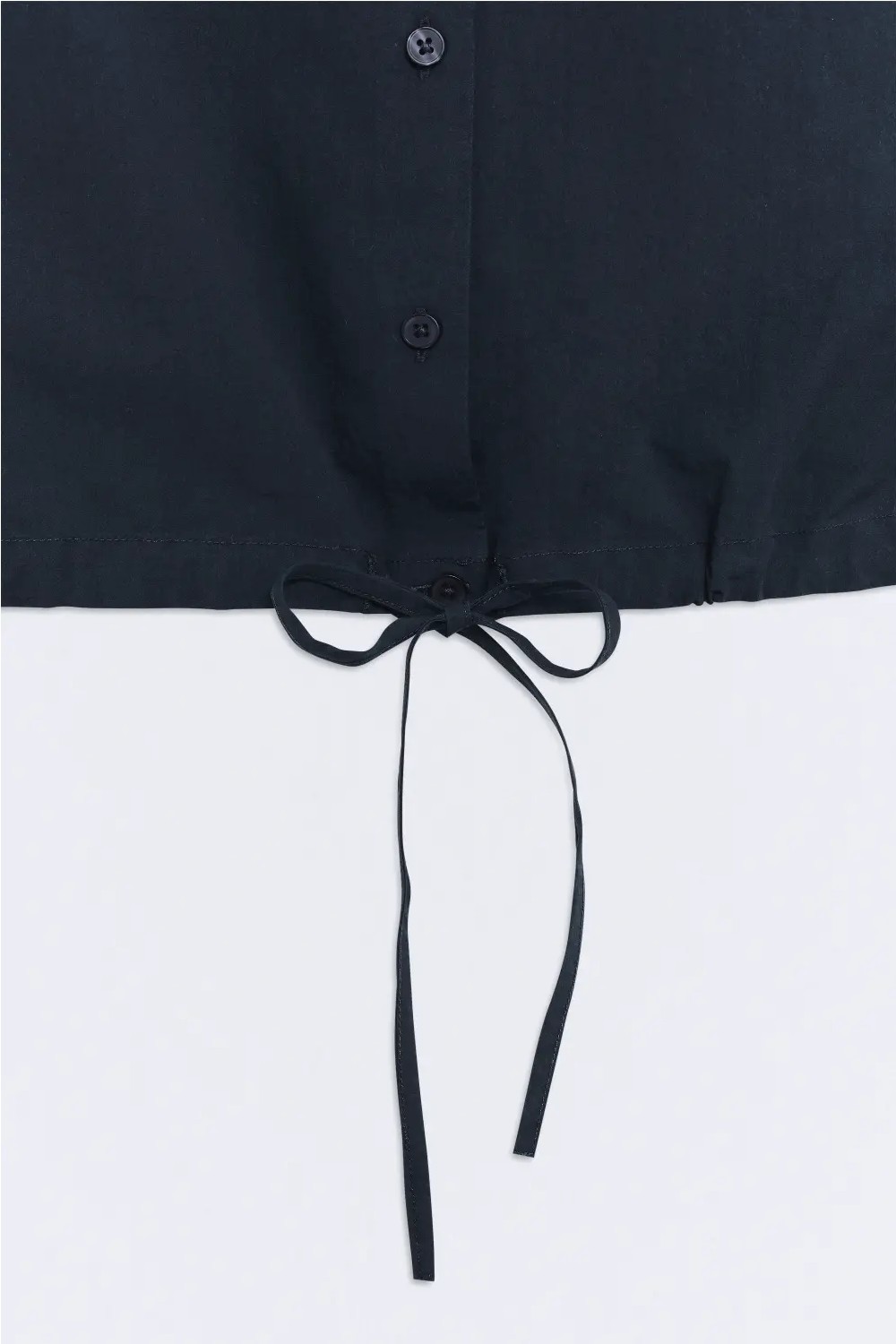 Camisa de 100% algodón BCI de manga corta. - Fitting recto y largo cropped. - Cierre central con botones a tono. - Con detalle de cinturón fruncido en cintura. - En color azul marino. - Largo prenda para talla S: 54 cm.