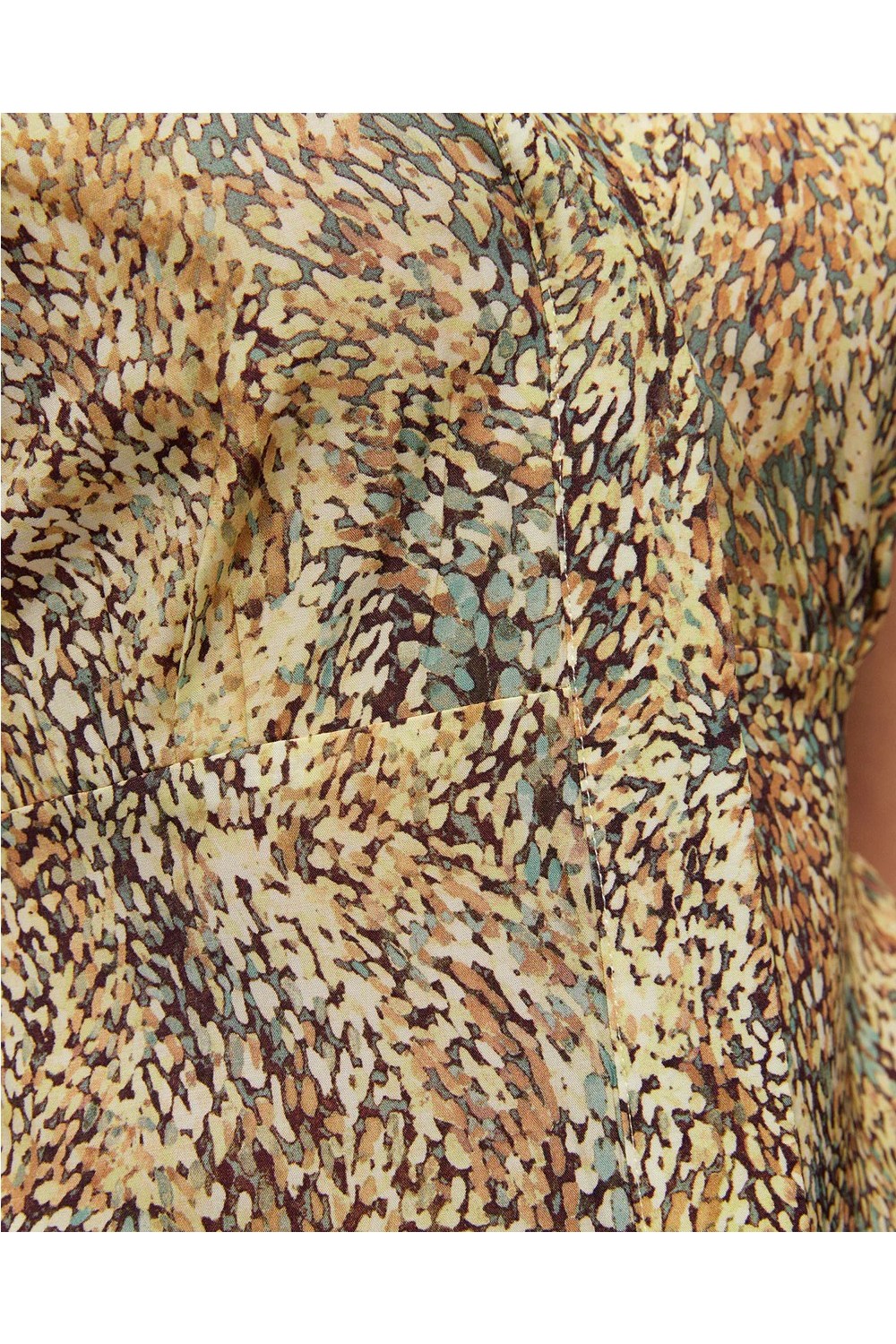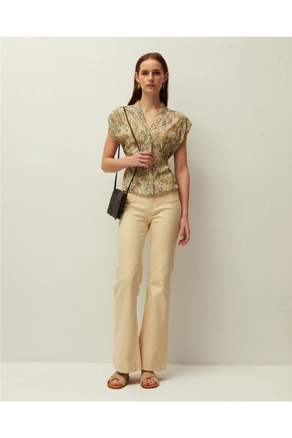 Camisa sin mangas y escote pico, con estampado de mini topos. Detalle de costura y cinturón bajo pecho. Cierre con botones en el delantero. Prenda sostenible.