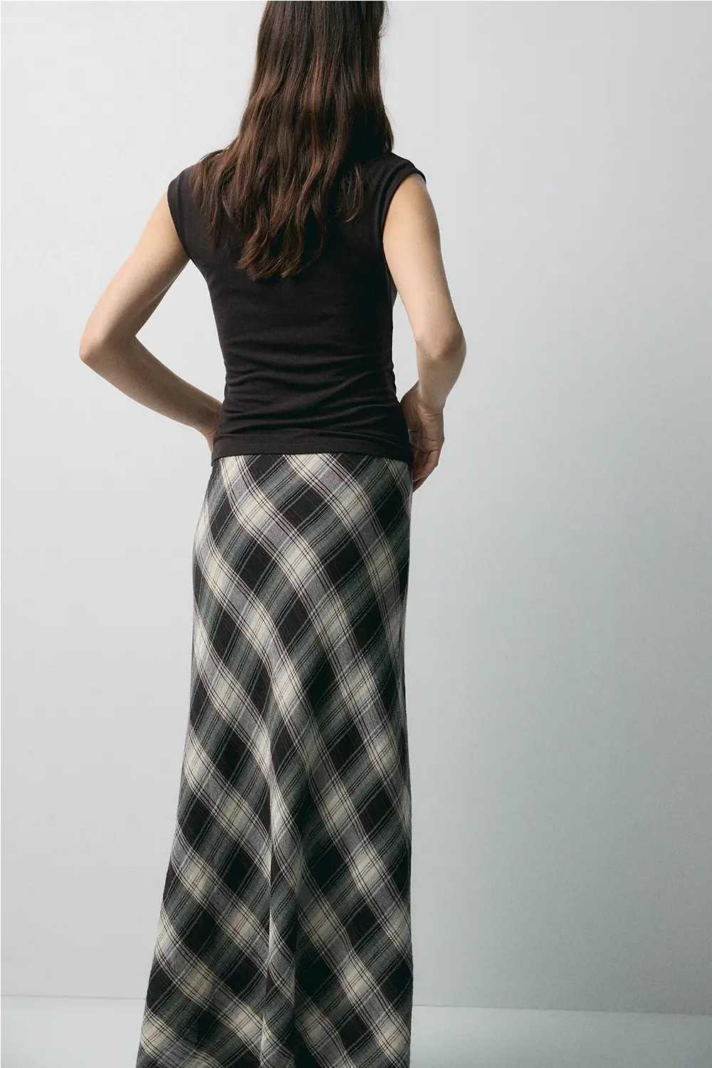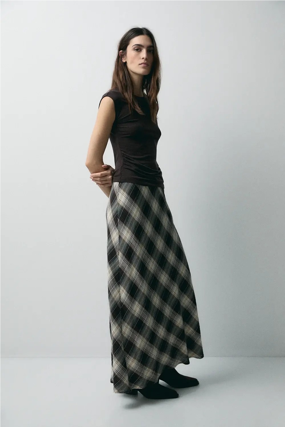 Camiseta de manga corta con fibras de lana. Fitting ajustado con detalles fruncidos en los laterales. Cuello redondo. En color chocolate. Largo prenda para talla S: 52 cm