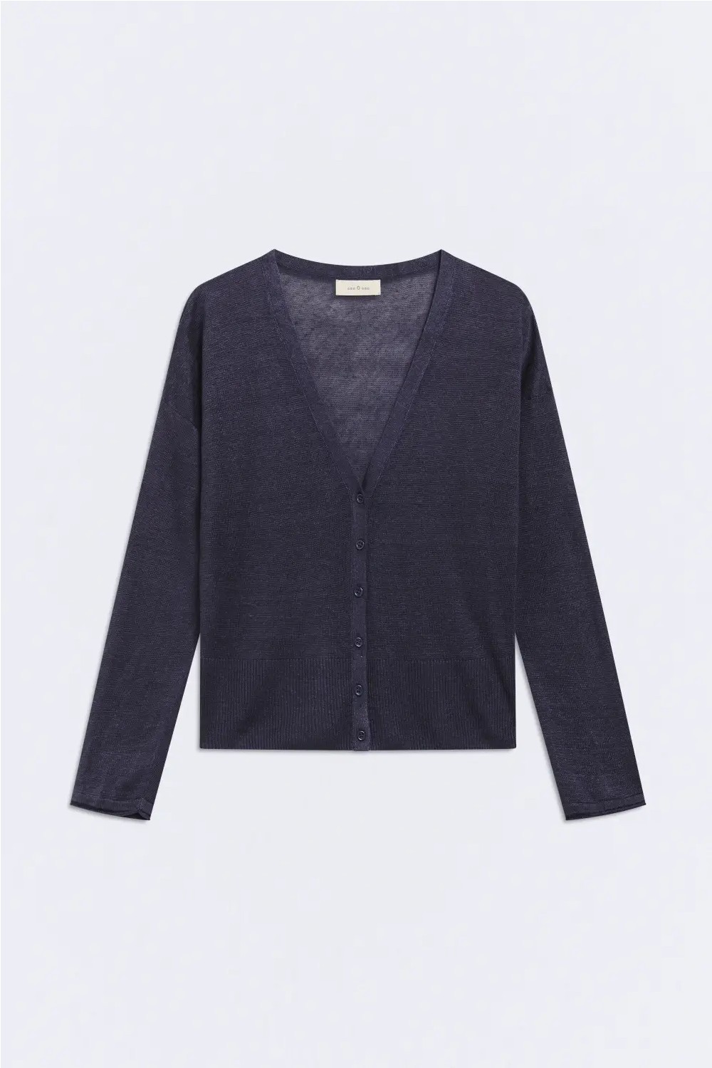 Cárdigan de tejido fino hecho de 100% lino. Con botonadura cruzada. Puños y bajo de la prenda a contraste.
