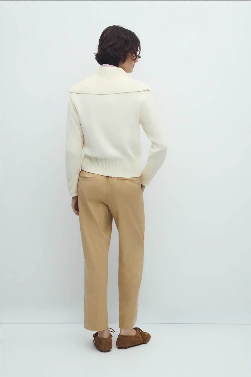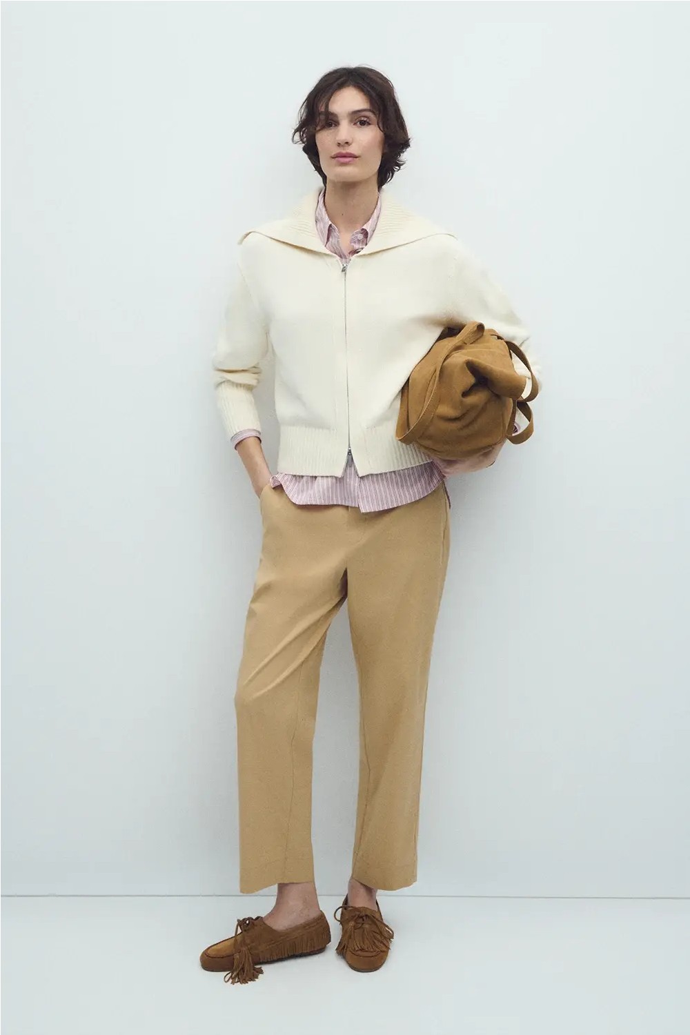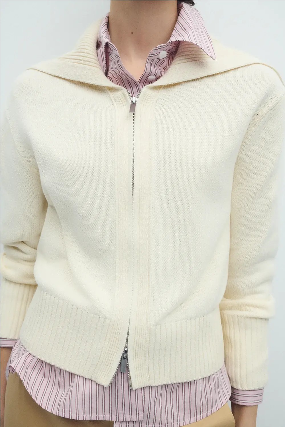 Cárdigan de cremallera hecho de 100% algodón BCI. - Tejido de grosor medio (galga 5). - Con cuello over tipo solapa. - Cierre de cremallera doble. - En color crudo.
