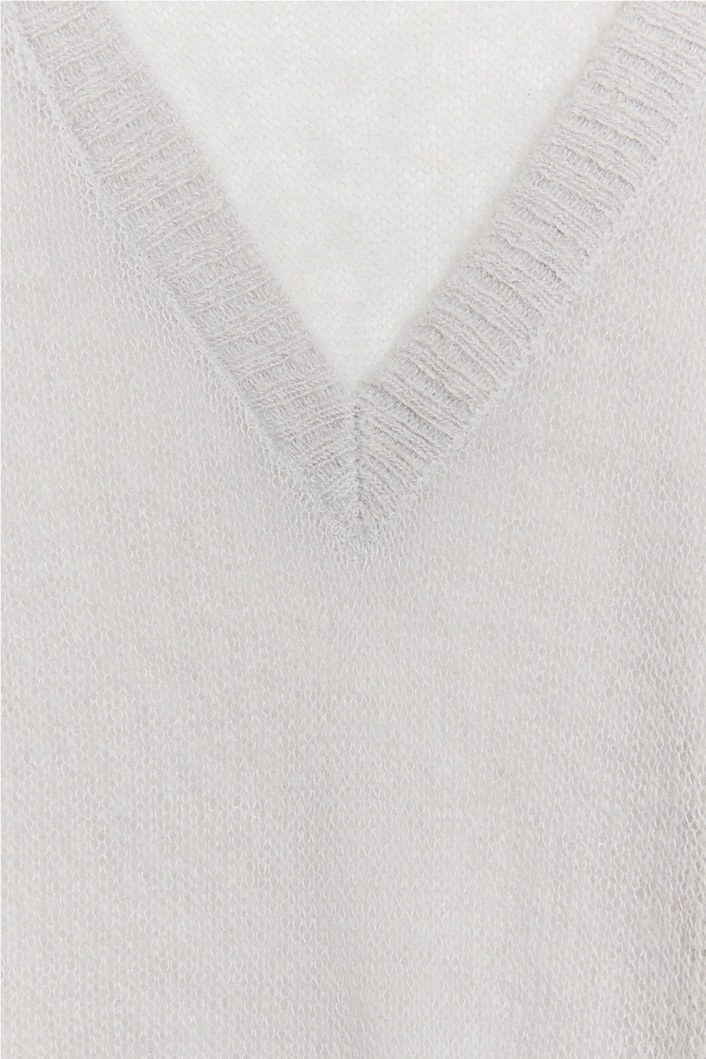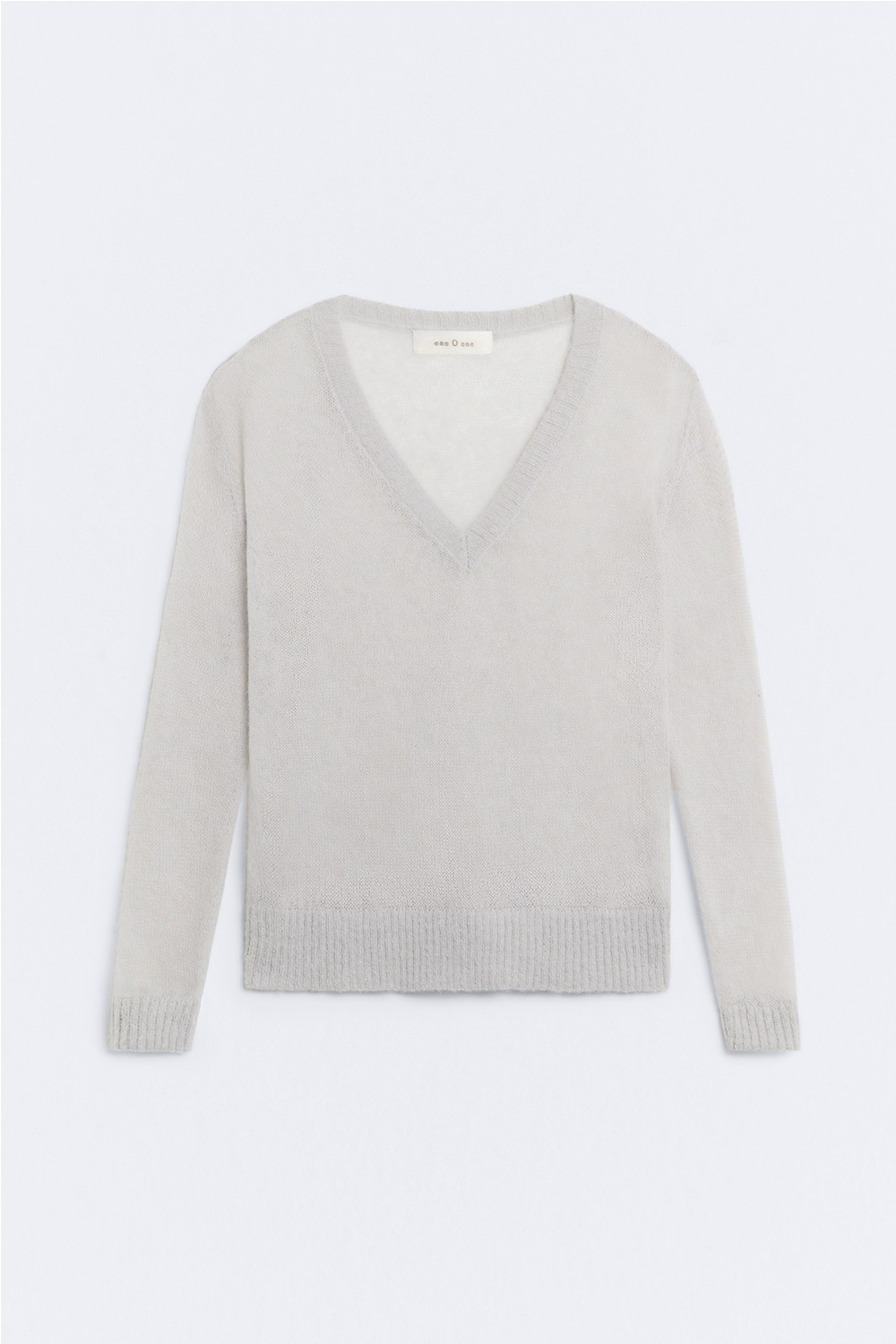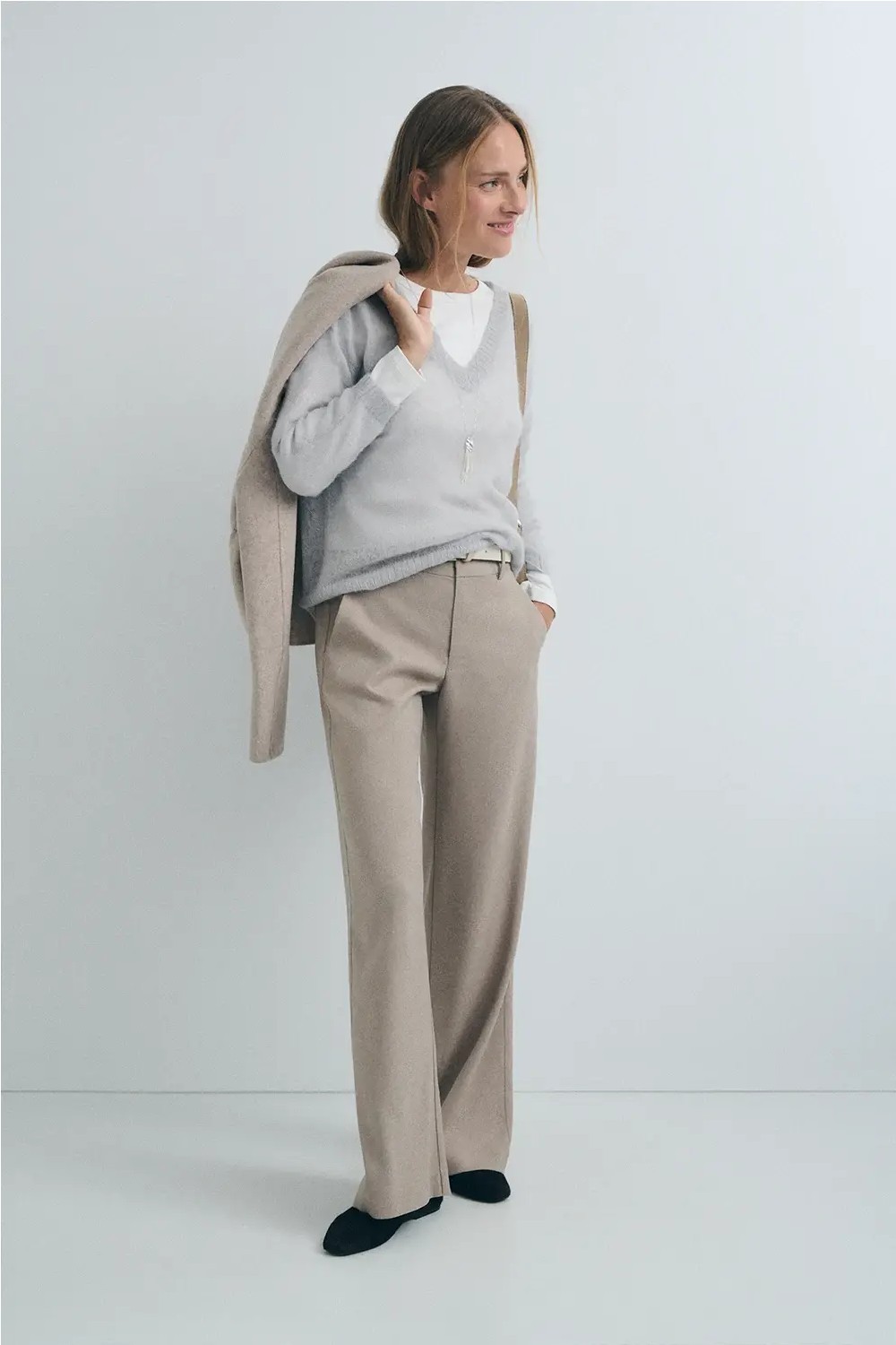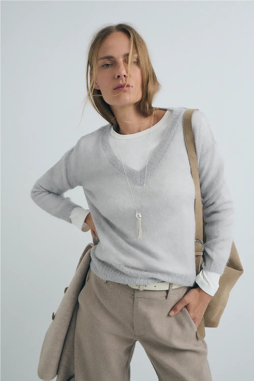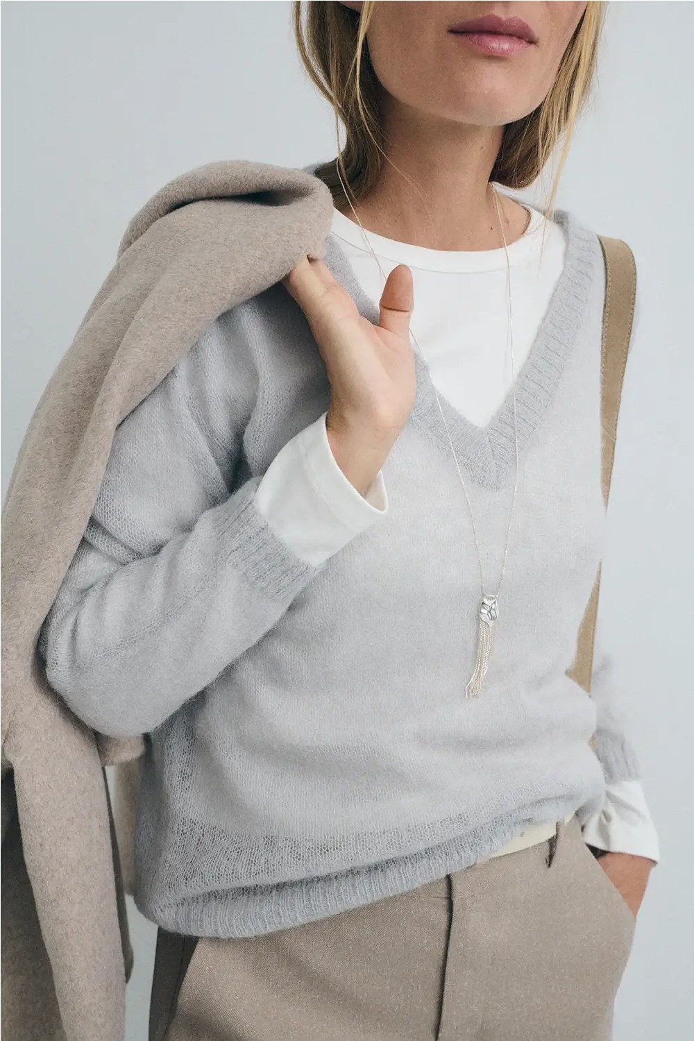 Jersey de galga media. Con composición de lana. Tejido ligeramente transparente. Escote en pico profundo. Fitting holgado. Tejido semitransparente. Largo prenda para talla S: 57 cm.