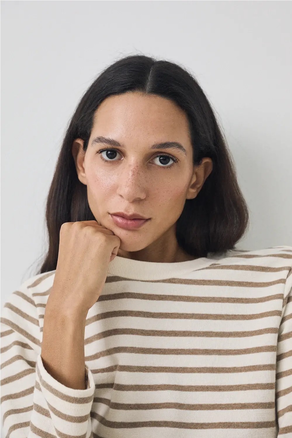 Sudadera básica de algodón orgánico. Con estampado de rayas. Tejido rústico. Cuello redondo. Hecha en Portugal. Largo prenda para talla S: 58,5 cm.
