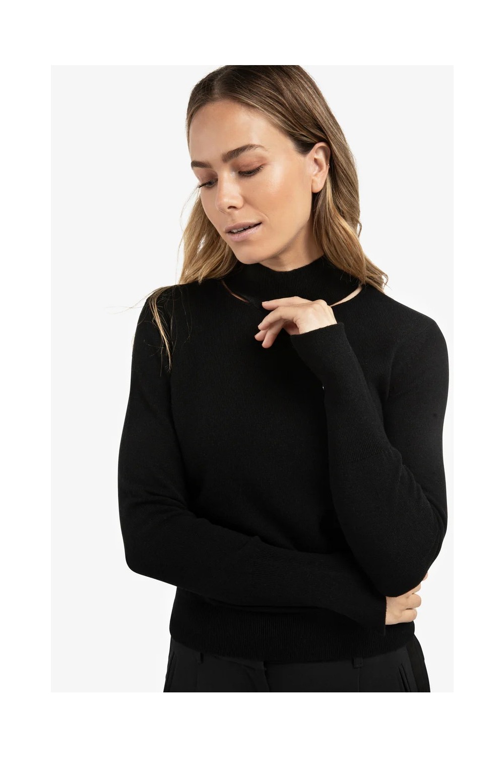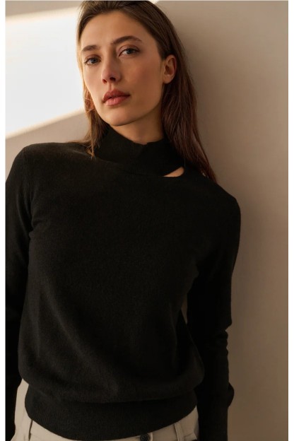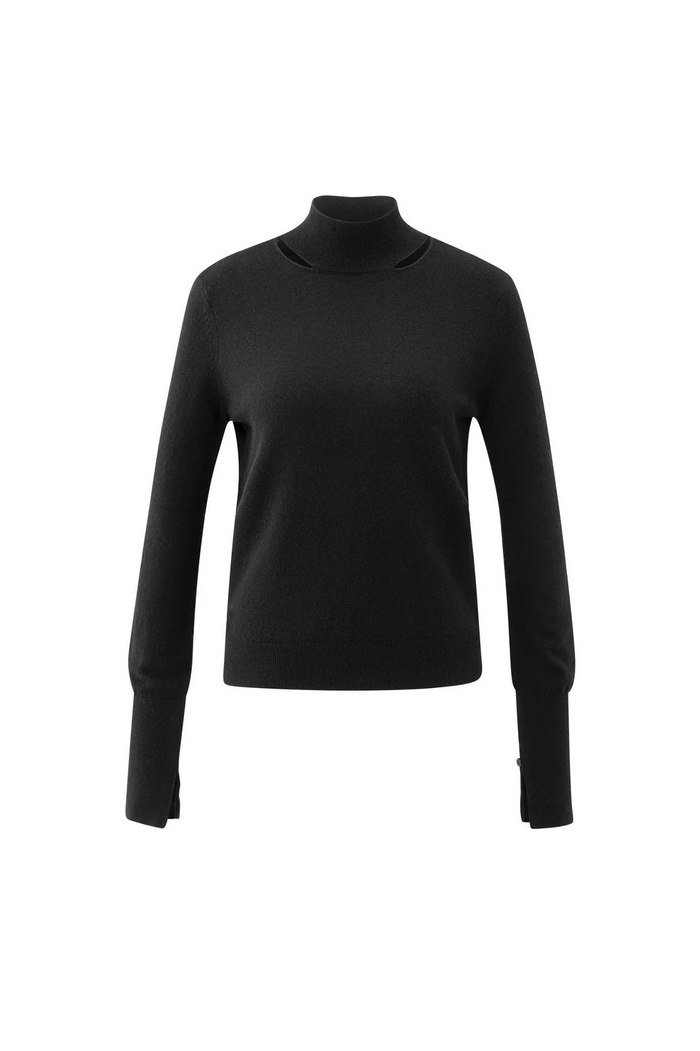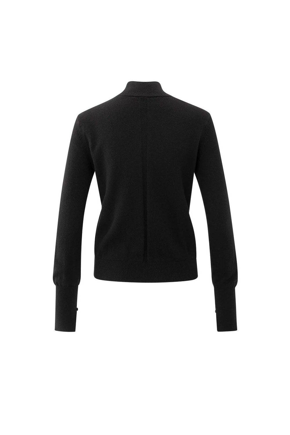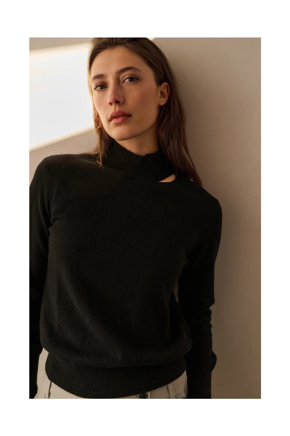 Este suéter de punto fino está confeccionado en una suave mezcla de lana y presenta un cuello alto con un elegante escote en V. Diseñado con mangas largas, puños acanalados con discretas aberturas y una silueta ajustada