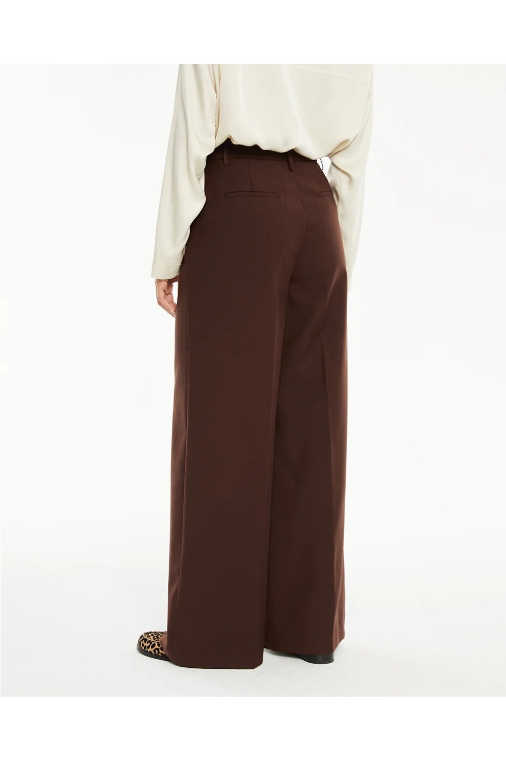 Pantalón ancho de mujer con pinzas en el delantero, bolsillos laterales y cierre con botón.