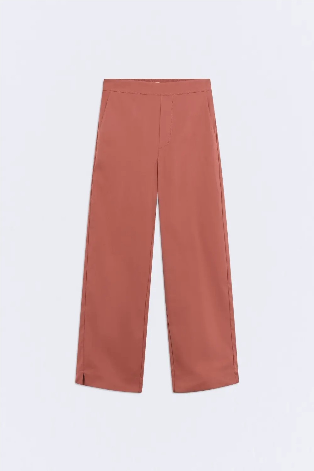 Pantalón de tiro alto de largo tobillero. - Corte recto tipo chino. - Con composición de algodón. - Bolsillos delanteros en diagonal. - Con goma en la parte trasera. - Sin cierre.