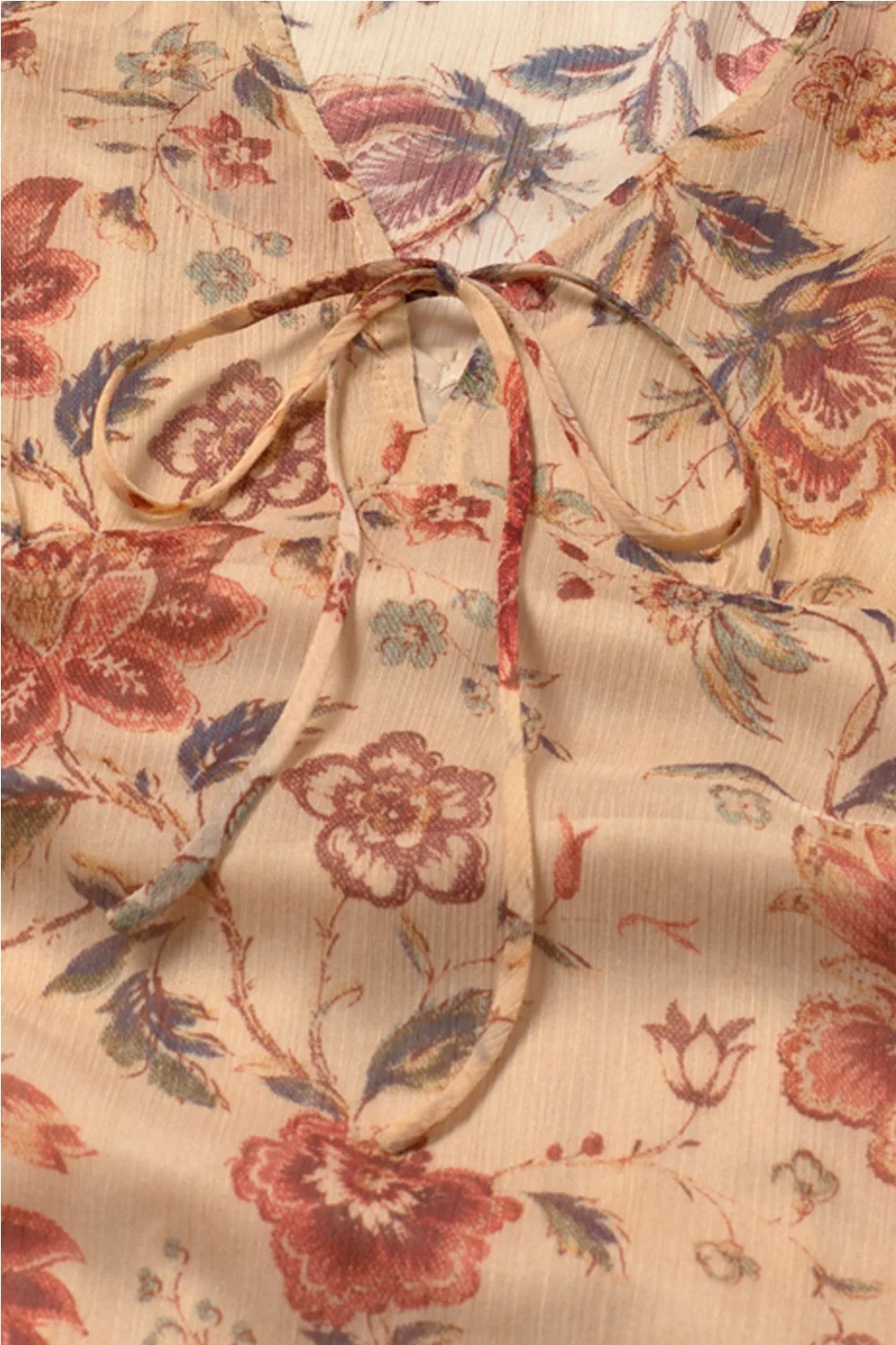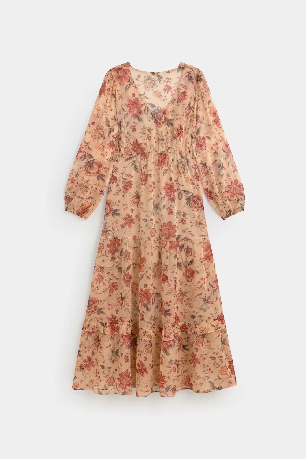 Vestido fluido largo. Diseño estampado floral, estilo boho. Escote pico con cierre de lazada. Corte bajo el pecho. Manga larga abullonada con goma elástica en el puño. Corte en el bajo. Sin cierre. Con forro. Fitting recto. Largo prenda para talla S: 136 cm.