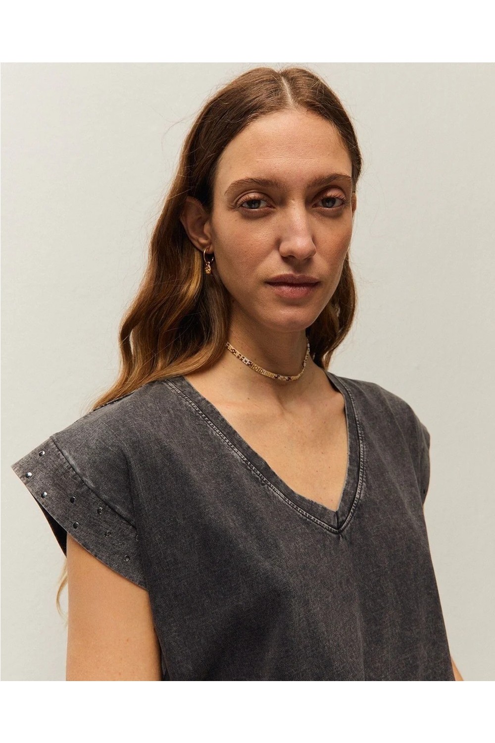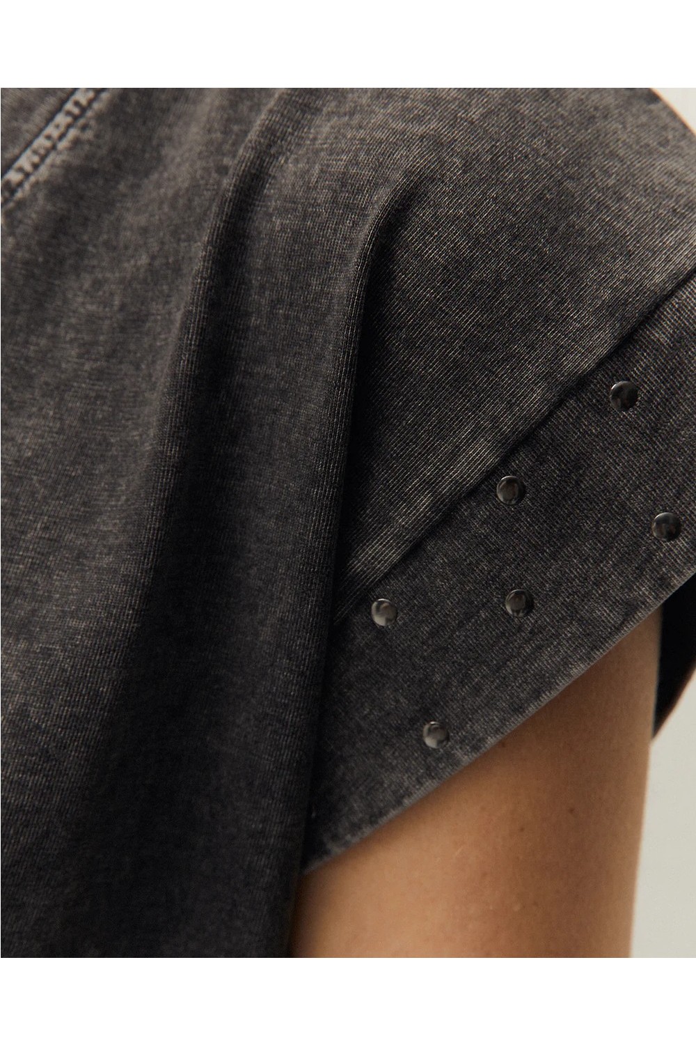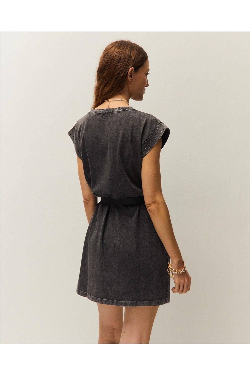 Vestido midi con cuello pico y manga corta. Detalle de tachas bajo la manga y abertura lateral en el bajo. Prenda sostenible.