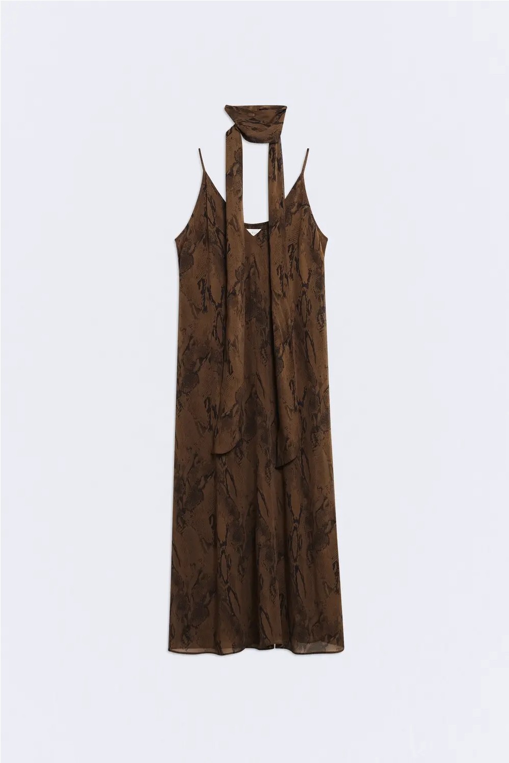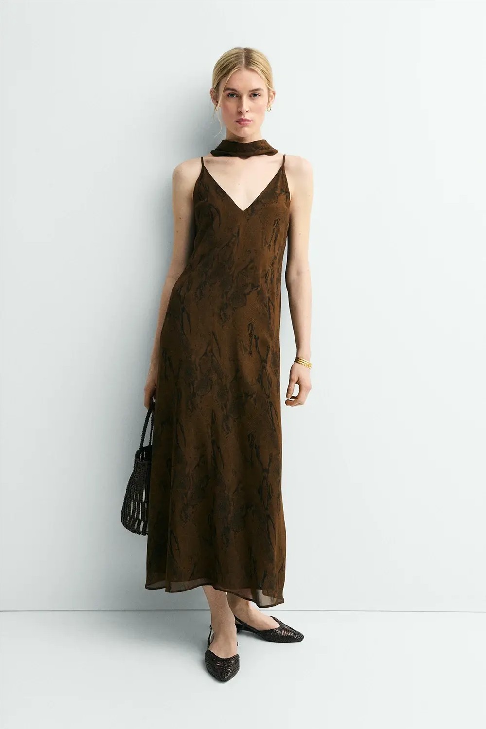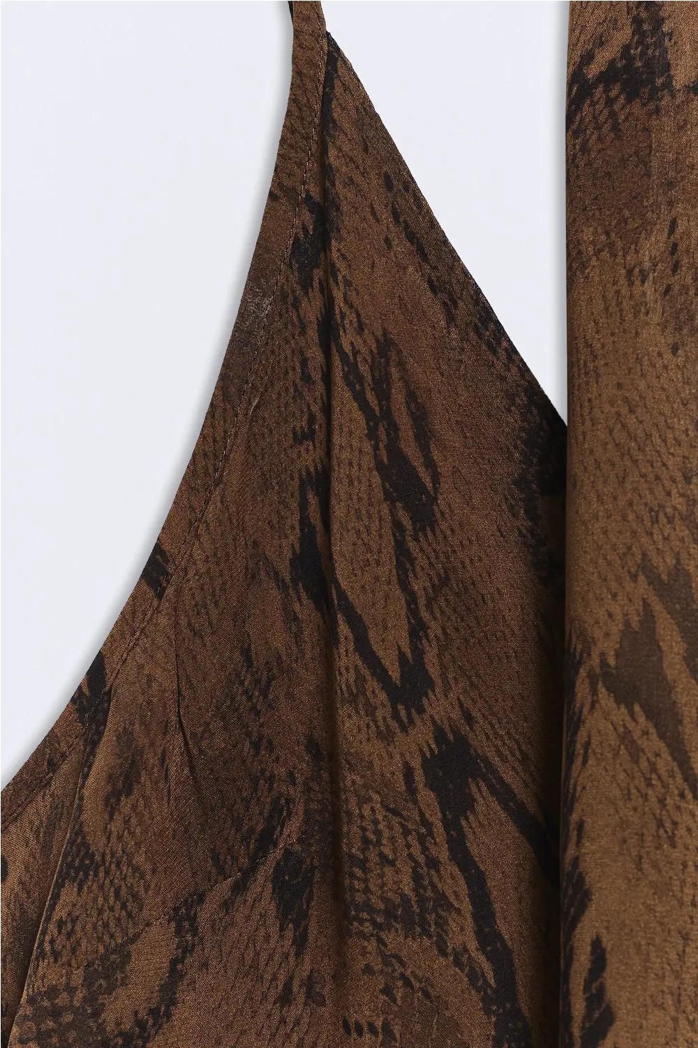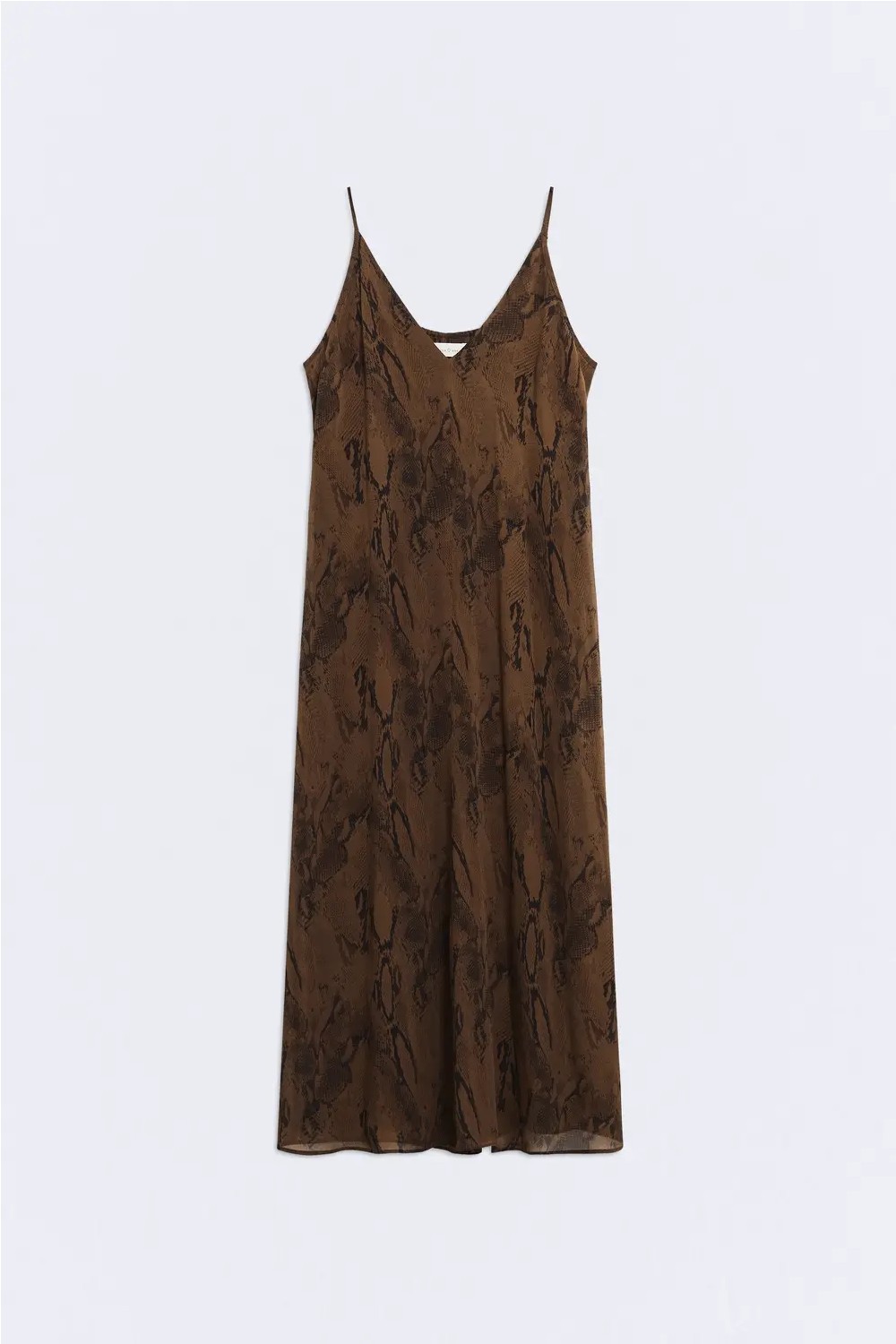 El vestido Nefertiti es una prenda ligera confeccionada en georgette de viscosa, un tejido fabricado en Italia que aporta caída y textura efecto rugosa, con fluidez y movimiento. Tiene forro interior y combina un tono marrón chocolate con un estampado efecto animal print.